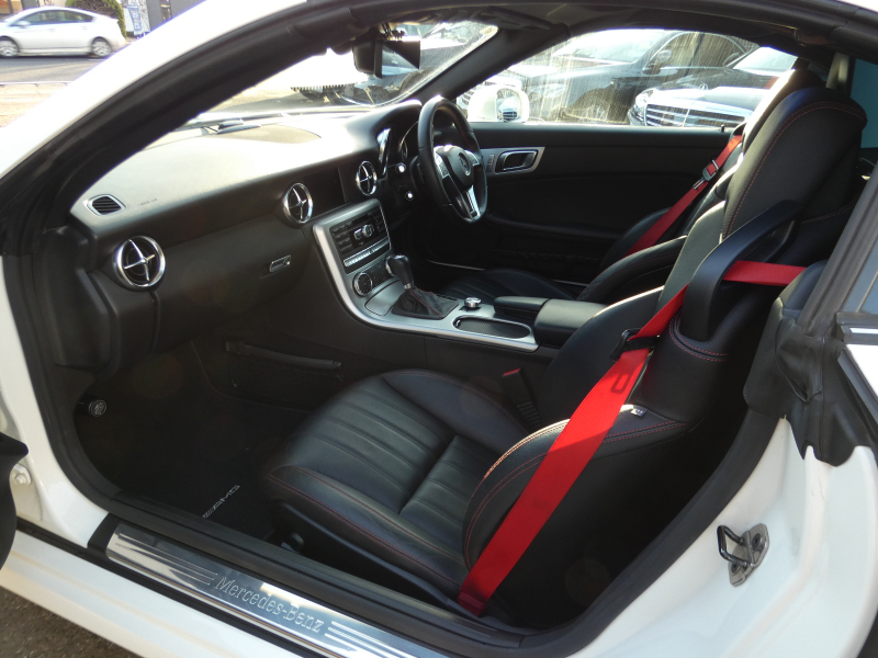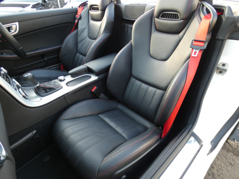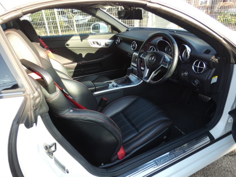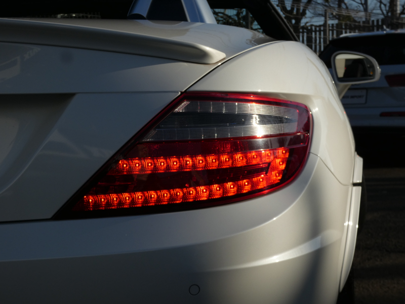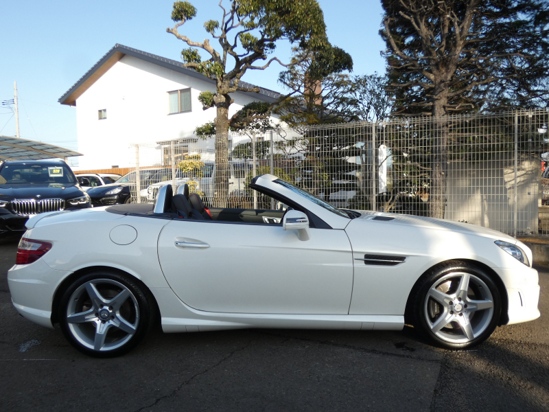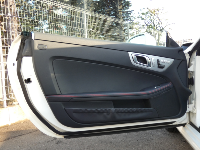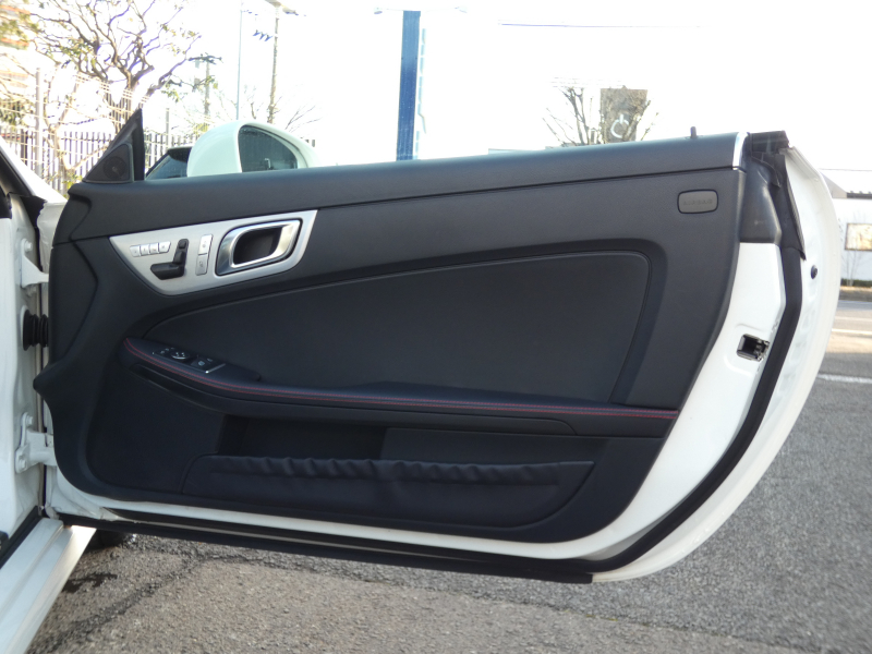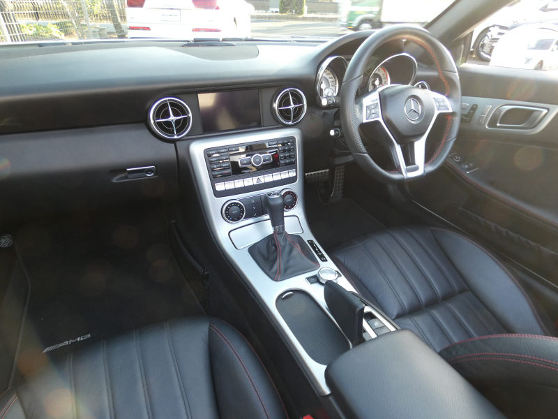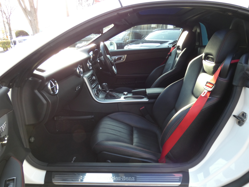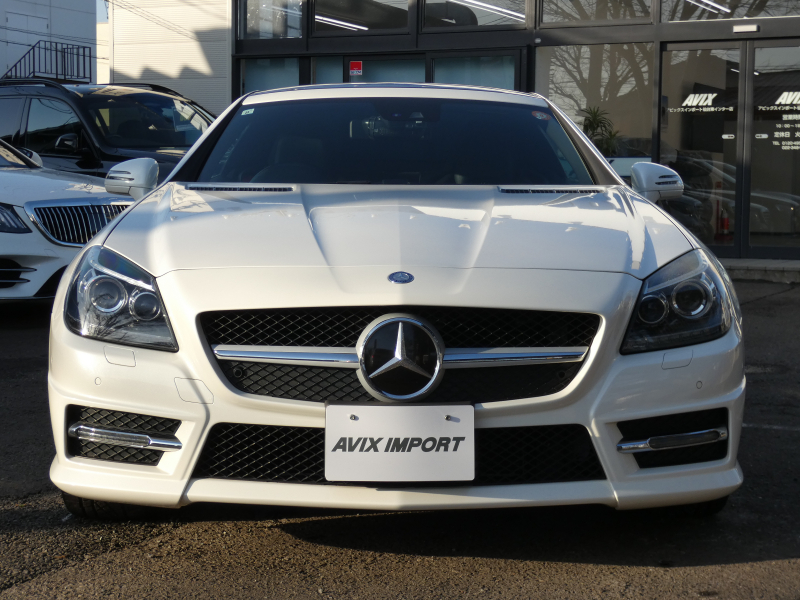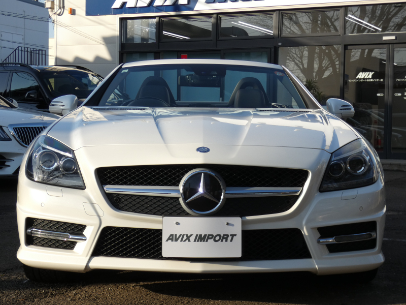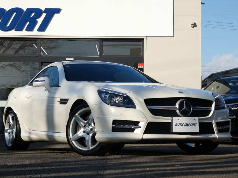 安心の正規ディーラー車!! 取説・記録簿付 事故歴ありません!! 綺麗な外装色ダイヤモンドホワイトにお洒落なAMGスポーツPKG専用エクステリア&18インチアルミホイール!! 室内は高級感漂うブラックレザーシート(レッドステッチ入り)に解放感のあるマジックスカイコントロールパノラミックバリオルーフや、快適なシートヒーターやエアスカーフ&エアガイドが装備されたレザーPKGもオプション装備!! 純正HDDナビ・CD(ミュージックレジスター)・地デジ・ETC、使い勝手の良いキーレスゴーや社外バックカメラも装備され、運転操作をサポートするパークトロニックセンサーやレーダーセーフティPKGも完備!! 上級グレードならではのダイナミックハンドリングPKGが装備されDOHC V型6気筒エンジン&7G-TRONICによりストレスの無いドライビングをお愉しみいただけ、さらにはアイドリングストップ機構により燃費向上を実現!! 税金面においても経済的で初めての方にもおすすめです!! R172型 上級グレードSLK350をお探しの方お急ぎ下さい!!