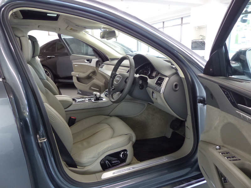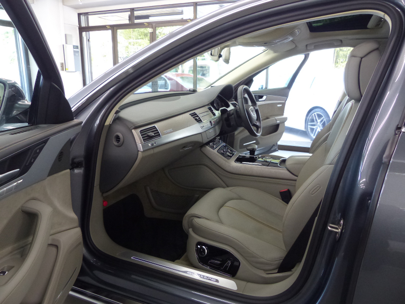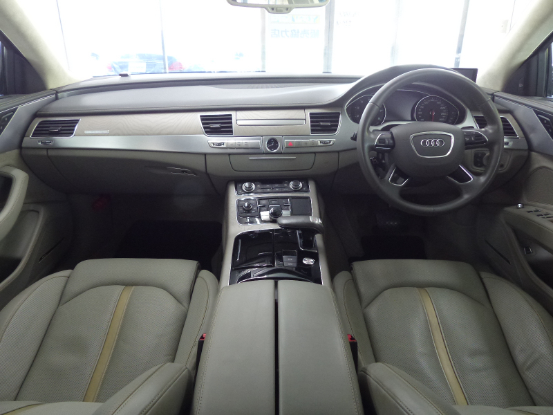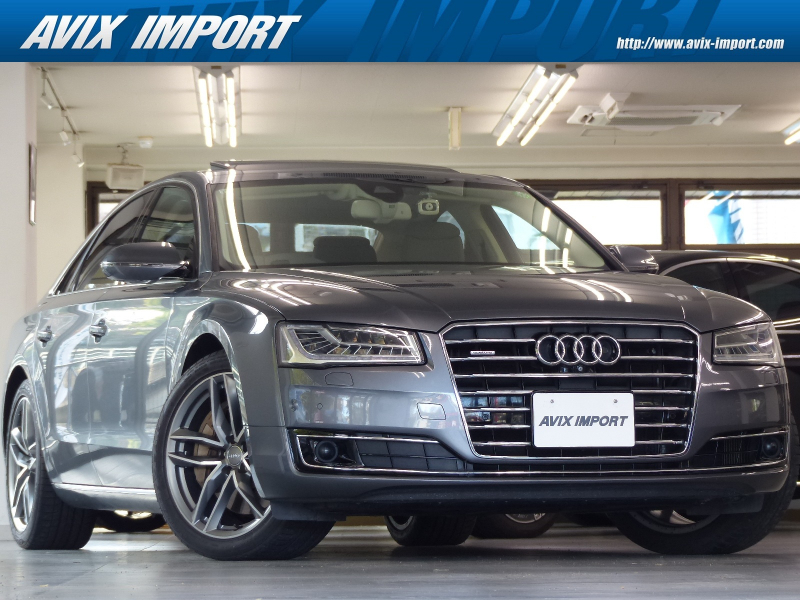 Audiのトッププレミアムセグメントに位置するA8!! 取説・記録簿付き もちろん修復歴ありません!! 最高出力435PS(カタログ値)という圧倒的なパワーを発揮する4.0L V型8気筒DOHCインタークーラー付ターボチャージャーを搭載し、電子制御ティプトロニック機構付き8速AT&エネルギーリカバリーシステム&スタートストップシステム&シリンダーオンデマンドシステム(気筒休止システム)などによりエンジン効率を高めて燃費向上を実現!! Audiならではのドライブセレクトとアダプティブエアサスペンションが標準装備され、様々な運転シーンごとに、意のままに走りを選び楽しむことが出来ます!! 後期型よりシングルフレームグリルデザインやバンパー&ボンネット形状を刷新し、革新的なマトリクスLED技術を使用したヘッドライトを採用!! 外装色は綺麗なモンスーングレーメタリック!! 内装はデザインセレクションならではのシカモアグレーバルコナレザー&ファイングレインアッシュナチュラルパールグレーパネルのハイセンスな組み合わせ!! タッチパッドと電動格納式大型モニターを備える最新世代のMMIにより直感的な操作を可能とし、ストレスの無いドライビングをご堪能頂けます!! シートポジションを細部まで設定できるコンフォート機能やシートから冷風が出るベンチレーションシート付のコンフォートシートが標準装備!! 安全装備プレセンスパッケージ・サラウンドビューカメラ・電動式サンブラインドはもちろんのこと、オプションのサンルーフ・4ゾーンデラックスオートマチックエアコンディショナー(後席シートヒーター付)・ナイトビジョン・5ツインスポークデザインマットチタンルックポリッシュト20インチアルミホイールが装備され、上級サルーンに相応しい豪華装備充実の車両となっております!! 品質・価格共に絶対の自信があります!! Audi A8 後期型 4.0TFSIクワトロをお探しの方は是非お急ぎ下さい!!
