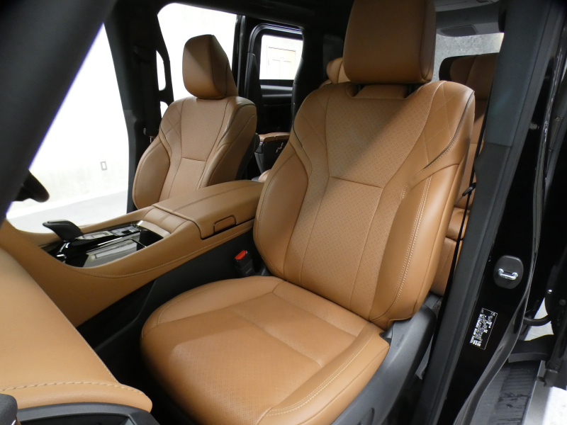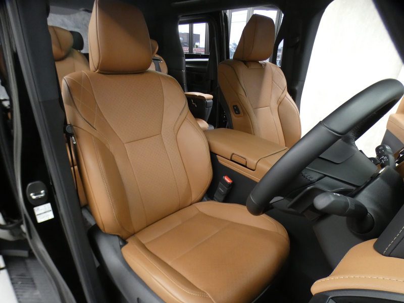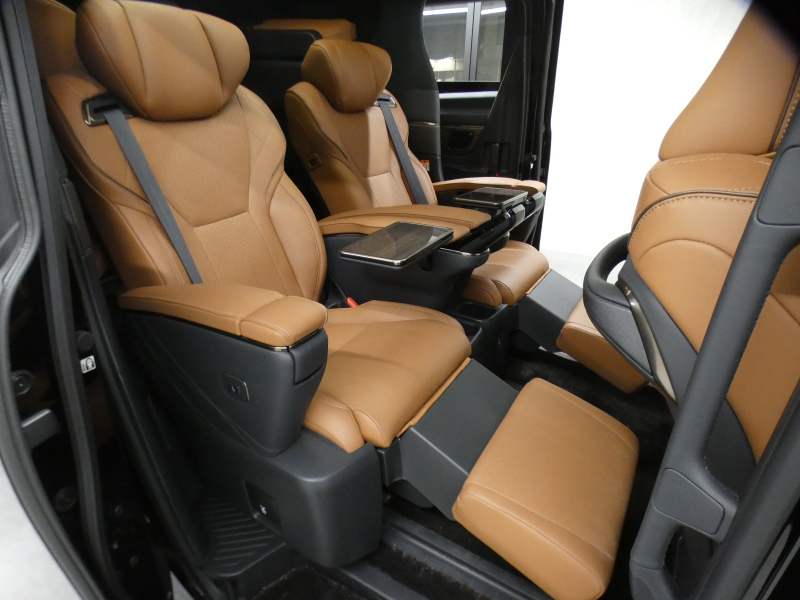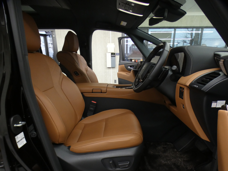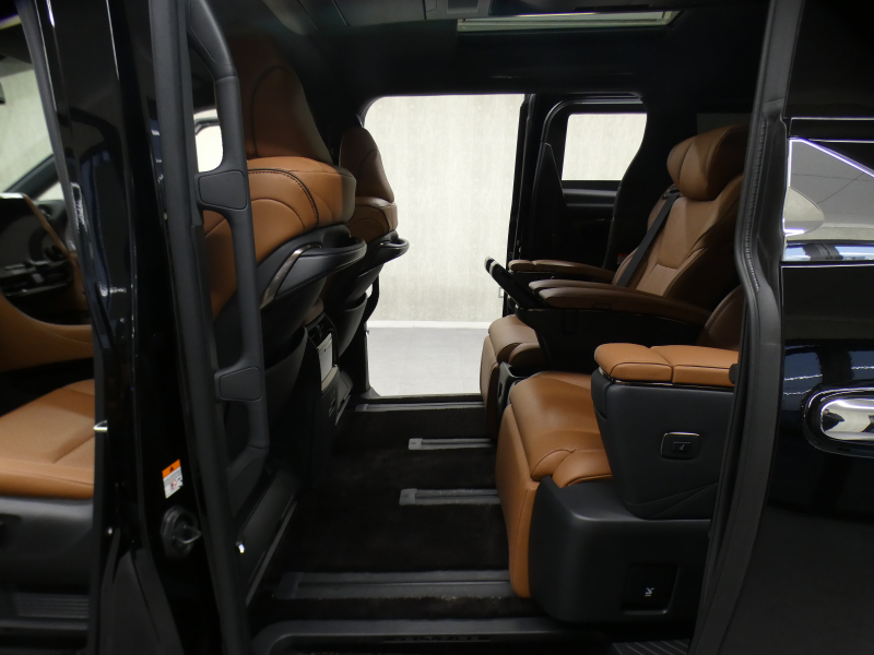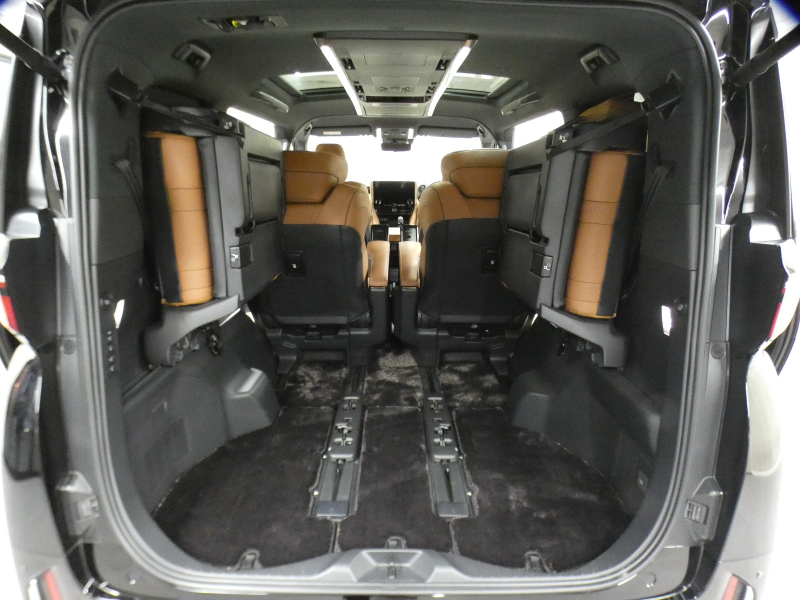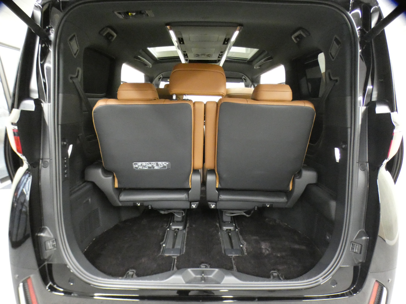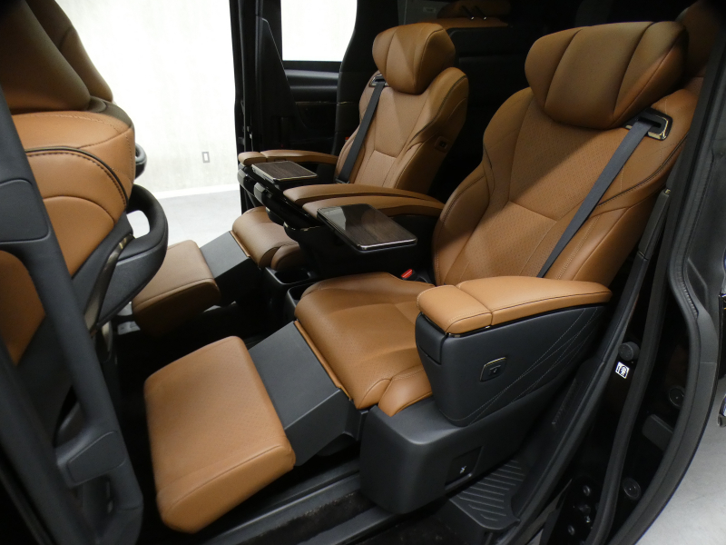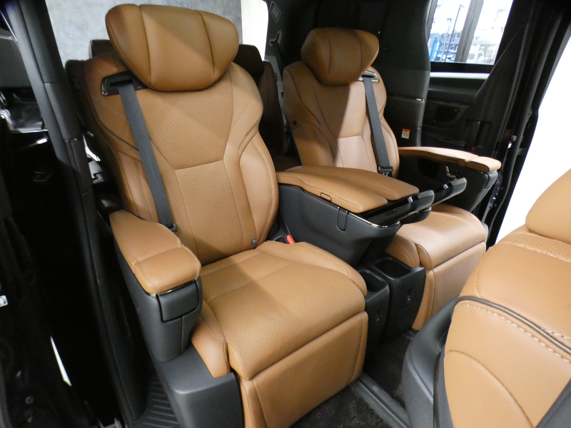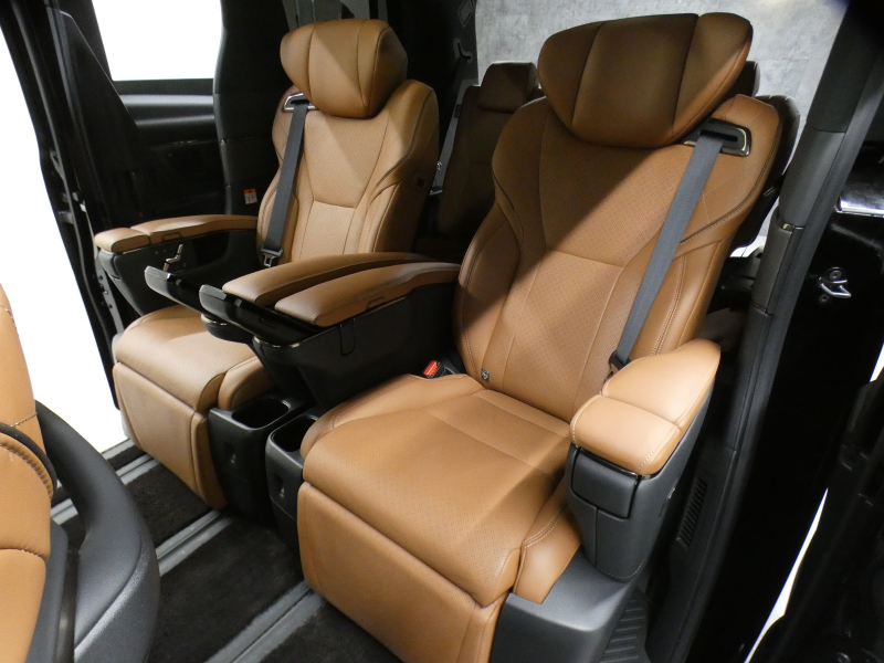 プレミアムナッパ本革シート表皮、フロントシート(運転席8ウェイパワーシート(前後スライド+リクライニング+シート上下+チルトアジャスター)&助手席4ウェイパワーシート(前後スライド+リクライニング)+後席用アシストグリップ、助手席可倒式ヘッドレスト、快適温熱シート+ベンチレーションシート(運転席・助手席)、助手席肩口パワーシートスイッチ(シートスライド&リクライニング)、デッキサイドセカンドパワーシート操作スイッチ、セカンドシート(エグゼクティブラウンジシート(機能:パワーロングスライド、リフレッシュシート、パワーリクライニング、メモリー機能(パワーリクライニング・パワーオットマン・チルトアジャスター)、(装備:パワーオットマン(伸縮機構付)、上下調整式大型ヘッドレスト、大型アームレスト(カップホルダー各席1個+小物入れ2個付)、マニュアルウォークインレバー、快適温熱シート(オットマン&アームレストヒーター付)+ベンチレーションシート、回転格納式テーブル(防汚処理付バニティミラー付/各席1)、リヤマルチオペレーションパネル(脱着式)、ファイルホルダー(物落ち防止スペーサー付))、サードシート(5:5分割2ポジションスペースアップシート(機能:跳ね上げアシスト機構、スライド、リクライニング)(装備:ヘッドレスト(全席)、回転式センターアームレスト)
