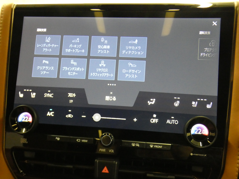 トヨタチームメイト(アドバンストパーク+パーキングサポートブレーキ(周囲静止物)(リモート機能付)、アドバンストドライブ(渋滞時支援)、パーキングサポートブレーキ(前後方静止物+後方接近車両+後方歩行者)、パノラミックビューモニター(床下透過表示機能付)