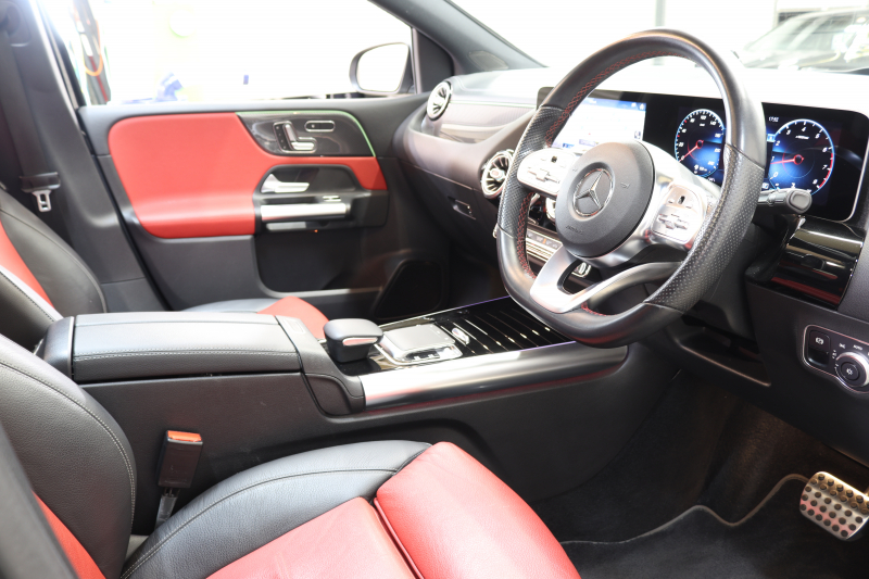 メルセデスベンツ Bクラス B180 AMGライン AMGレザーエクスクルーシブ&アドバンスド&ナビゲーション&レーダーセーフティPKG 1オーナー キーレスゴー 黒/赤本革 パノラマSR ヘッドアップD MBUXナビTV BT音楽 360カメラ PTS LEDライト 自動Rゲート ハンズフリーA AMGエアロ&18AW ワイヤレス充電 7AT 2年保証