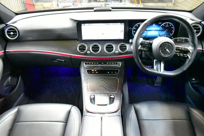 メルセデスベンツ Eクラス E200 スポーツ エクスクルーシブAMGラインインテリアP レーダーセーフティP 1オーナー 後期型 MEコネクト 燃費13.1KM 全席ヒーター黒革 ディストロ BSM Lチェンジ AMGエアロ19AW キーレスGO パークトロ HUD ブルメS マルチカラーアンビエント 対話式ナビ 360カメラ 2年保証