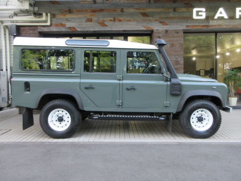 ランドローバー ディフェンダー 110SW 2.2Tdci 稀少サンルーフ Wolfホワイトスチールホイール 5人乗り AT換装済 Nox/Pm適合 3ナンバー ホワイトコントラストルーフ 新品Heritageフロントグリル ヘッドライトサラウンドパネル左右ボディ同色 シュノーケルKIT 前後マッドフラップ サイドランナー 背面タイヤ 並行輸入車 右ハンドル 記録簿付