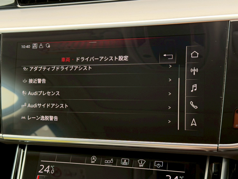 HDマトリクスLEDヘッドライトダイナミックターンインディケーター、ヘッドライトウォッシャー、デイタイムランニングライト、LEDリヤコンビネーションライトダイナミックターンインディケーターター、エクステリアミラーハウジング アルミニウムルック、S バンパー、ダブルアコースティックグレージング、エクステリアミラー電動調整&格納機能自動防眩機能メモリー機能、アルミホイール5ダブルスポークスターデザイン9]×21、265/35R21、タイヤリペアキット、コンフォートスポーツシート(フロント)、バルコナレザー、フルレザーパッケージ、電動調整機能 メモリー機能(フロント)、ランバーサポート 4ウェイ、リヤシート3シーター、リヤヘッドレスト、シートヒーター(フロント&リヤ)、シートベンチレーション マッサージ機能(フロント)、シートベルトモニタリング、エクステンディッドアルミニウムブラック/プラックグラスルックコントロールパネル、デコラティブパネル カーボンベクター、ローワーデコラティブパネル マットブラッシュトアルミニウム、ステアリングホイール、ダブルスポークマルチファンクションパドルシフトヒーター付、MMIナビゲーション、ハンズフリー(Bluetooth)、Audi connect、スマートフォンインターフェイス、Audi connect セーフティ&サービス、バーチャルコックピット、ミュージックインターフェイス、ミュージックインターフェイスリヤ、TV,スピーカーシステム,オートクロージングドア,ヘッドライニング,ヒーティング/エアコンディショニンシステム,ヘッドアップディスプレイ,インテリアライティング,センターアームレストシフトノブ/セレクターレバー,サンスクリーン,サスペンション,リヤアクスル,リヤアクスルディファレンシャル,セーフティシステム,カメラシステム/アクシデントセンサー,クルーズコントロール,ヘッディングコントロール,フロントアシスト,ドライバーアシスト,エアバッグ,サイドエアバッグ、盗難防止装置,パーキングエイド,トランクリッド/テールゲート操作、ドア/トランクロックシステム,ファーストエイドキット/三角表示板、チャイルドシートアンカー,フロントクロストラフィックアシスト,TVチューナー,Bang & Olufsen 3Dサウンドシステム(17スピーカー),パワークロージングドア,標準ヘッドライニング,4ゾーンデラックスオートマチックエアコンディショナー,ヘッドアップディスプレイ,マルチカラーアンビエントライティング,コンフォートアームレスト(フロント),セレクターレバーカーボン,電動サンプラインド(リヤ/リヤサイド),プレディクティブアクティブサスペンション,ダイナミックオールホイールステアリング,リヤスポーツディファレンシャル,アウディプレセンスリヤ,サラウンドビューカメラ、アダプティブドライブアシスト,アウディアクティブレーンアシスト/エマージェンシーアシスト,アウディプレセンスシティ,アウディサイドアシスト、エアバッグ(フロント)助手席エアバッグカットオフスイッチ付,サイドエアバッグ(フロント/リヤ),イモビライザー/盗難警報装置,カーブストーンアシスト,オートマチックトランクリッド,アドバンストキーシステム(デッドロック機能付),三角表示板,チャイルドシートアンカー,フロントクロストラフィックアシスト