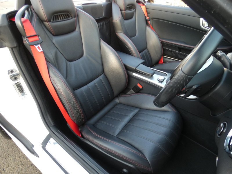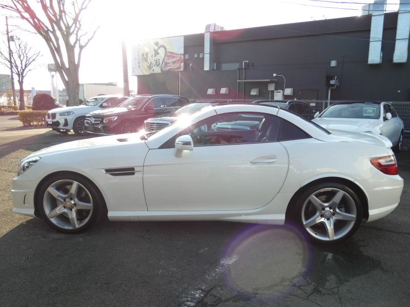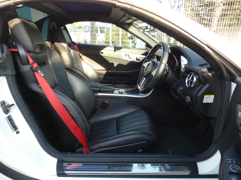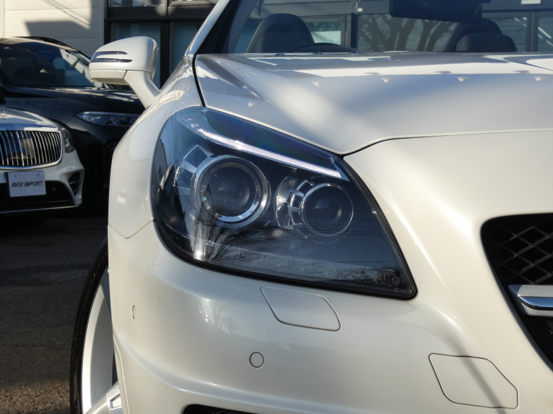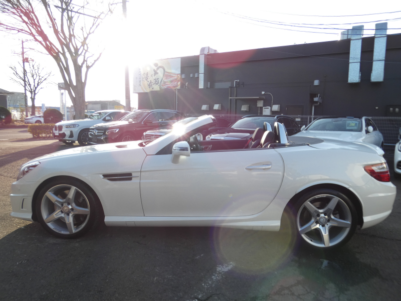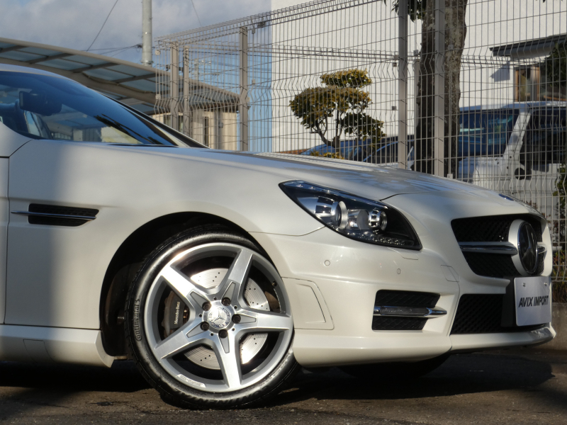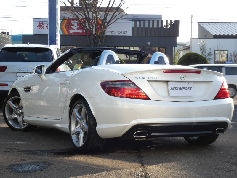 安心の正規ディーラー車!! 取説・記録簿付 事故歴ありません!! 綺麗な外装色ダイヤモンドホワイトにお洒落なAMGスポーツPKG専用エクステリア&18インチアルミホイール!! 室内は高級感漂うブラックレザーシート(レッドステッチ入り)に解放感のあるマジックスカイコントロールパノラミックバリオルーフや、快適なシートヒーターやエアスカーフ&エアガイドが装備されたレザーPKGもオプション装備!! 純正HDDナビ・CD(ミュージックレジスター)・地デジ・ETC、使い勝手の良いキーレスゴーや社外バックカメラも装備され、運転操作をサポートするパークトロニックセンサーやレーダーセーフティPKGも完備!! 上級グレードならではのダイナミックハンドリングPKGが装備されDOHC V型6気筒エンジン&7G-TRONICによりストレスの無いドライビングをお愉しみいただけ、さらにはアイドリングストップ機構により燃費向上を実現!! 税金面においても経済的で初めての方にもおすすめです!! R172型 上級グレードSLK350をお探しの方お急ぎ下さい!!