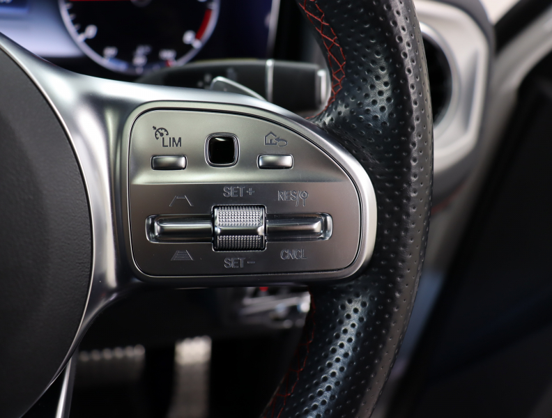 サイドストリップライン(ブラッシュドアルミニウム)、本革シート(ブラック、レッドステッチ入)、AMGスポーツステアリング