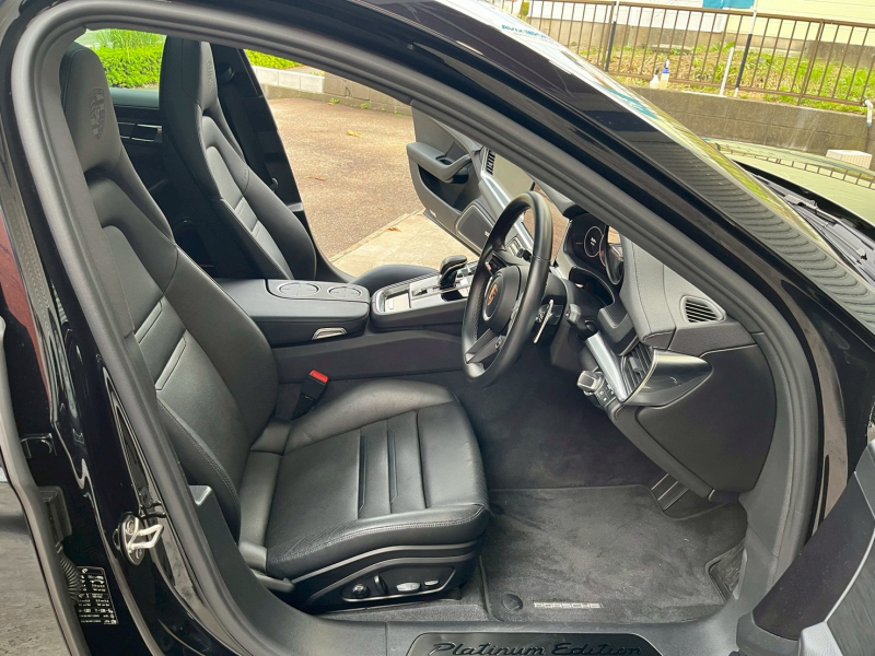 安心の右ハンドル、正規ディーラー車!! 取説・記録簿付 もちろん事故歴御座いません!! 人気の外装色ブラック!! 従来までオプション設定だったスポーツデザインフロントスポイラーが標準装備となった後期型エクステリアをベースにプラチナエディションならではの専用21インチエクスクルーシブデザインスポーツホイール(プラチナ塗装)やブラック仕上げスポーツテールパイプ&ハイグロスブラックサイドウインドウトリム、LEDマトリックスヘッドライト&専用エクスクルーシブデザインテールライトが標準装備され迫力有るエクステリアを演出!! 使用感の少ない心地よい禁煙の室内は落ち着いたブラックレザーシートにプラチナエディションならではの14Wayメモリー付パワーシート&全席シートヒーター、パノラミックルーフシステム、ブラッシュアルミニウムインテリアパッケージ(ブラック)、エンボス加工ヘッドレスト、BOSEサウンドシステム、GTスポーツステアリング(ヒーター付)が標準装備!! さらにはベンチレーターや4ゾーンエアコン、アンビエントライトと豪華装備満載!! 高解像度12インチタッチスクリーンを採用したPCMナビ(ポルシェコミュニケーションマネジメントシステム)搭載!! 運転操作をサポートするサラウンドビュー付パークアシストシステム、ACC(アダプティブクルーズコントロール)&LCA(レーンチェンジアシスト) 便利なコンフォートアクセス&ソフトクローズドアがオプション装備!! 2.9L V型6気筒ツインターボエンジン&スポーツクロノPKG&PASM付アダプティブエアサスペンションにより言葉に尽くせないドライビングの醍醐味を堪能することができます!!
