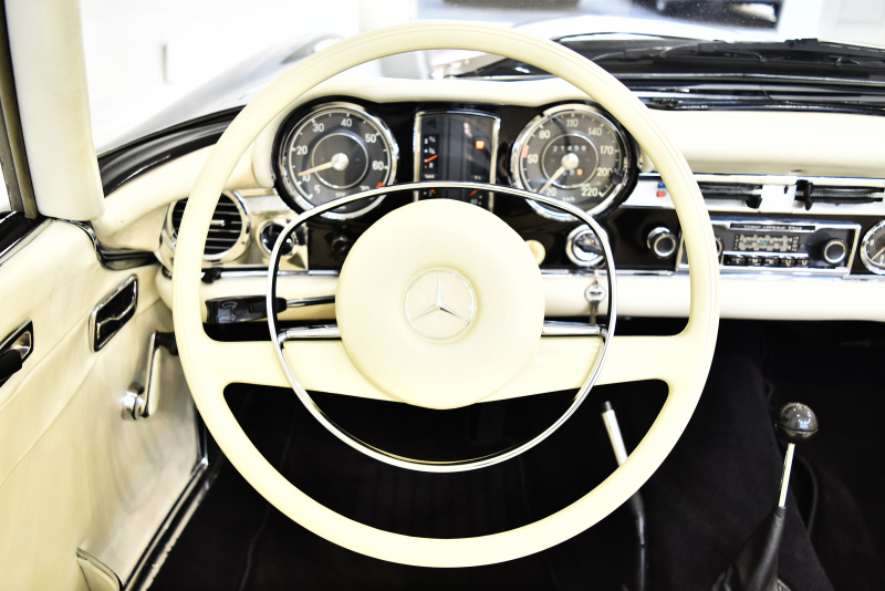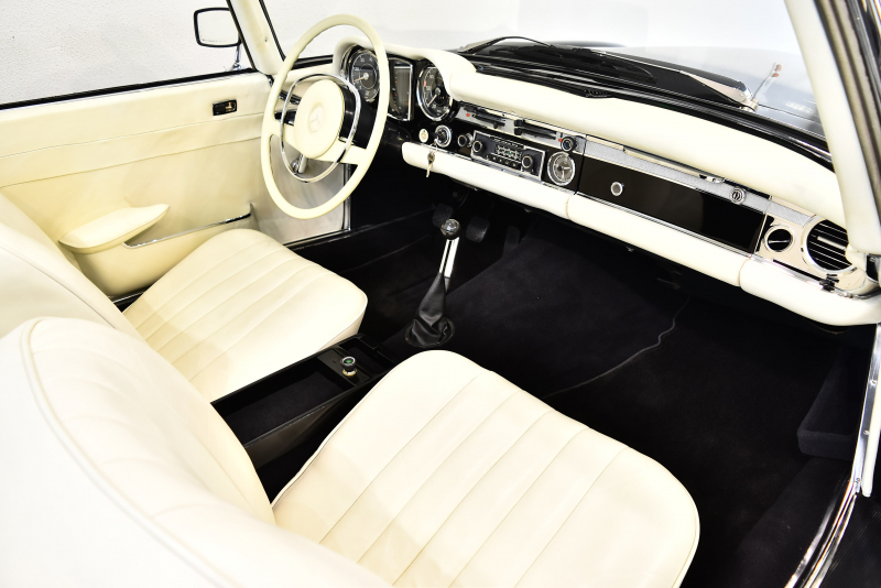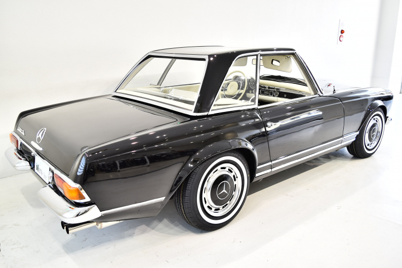 伝説的な300SLの後継として、現代のSLシリーズ原型となった最高傑作スポーツクーペ。現在のSLクラスの礎となったW113は、ガルウィングが代名詞のフラッグシップ300SLロードスターとその汎用タイプだった190SLを1台にまとめる狙いがあった。ほとんどレース用の仕様といって過言でなかった300SLに較べて、W113は当時の高級仕様だったオートマチックとパワーステアリングをオプションで選択可能にし、明確にスポーツ性能と快適性を両立させる量産スポーツクーペの礎を作ったとも言えるだろう。ボンネット、トランクリッドなど軽量化のためにアルミパーツが使用され、比較的短いボディ形状とあいまってW113の優れたハンドリングを可能にした。W113は北米マーケットを意識した仕様となり1963年の登場以来、排気量はモデルを追うごとに増大していった。仕様は2シーターでハードトップ、ソフトトップ、フルオープンと3つの仕様が選べたが、後方スペースを拡大し2座追加した「カリフォルニア・ロードスター」というモデルも存在している。またハードトップは東洋建築にヒントを得ている「パゴダ・ルーフ」と呼ばれる形状で、そのまま愛称“パゴダ”と呼ばれていた。デザインはポール・ブラックによるもので、画家や彫刻家の肩書ももつ異才のプロダクトデザイナー。そのブラックの最高傑作といわれるW113を「もっとも美しいメルセデス」に挙げるエンスージアストは多い。